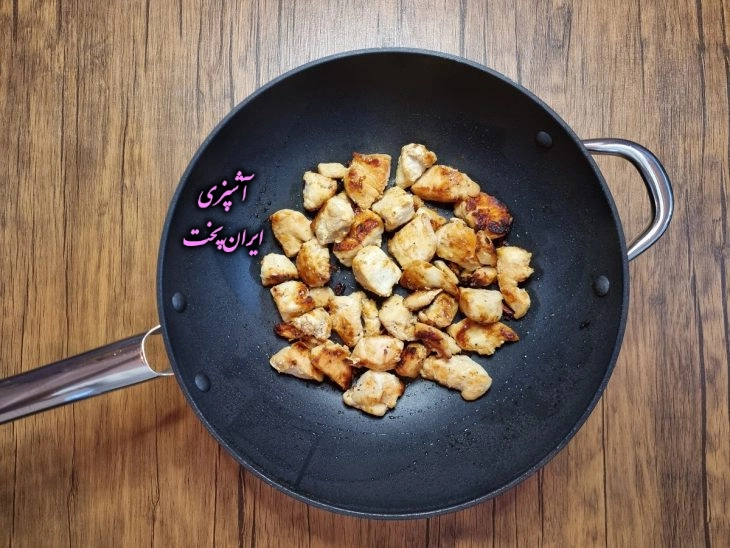 در یک ماهیتابه، کره باقیمانده را اضافه کنید و مرغ را سرخ کنید. مرتب هم بزنید تا همه قسمت های مرغ به یک اندازه پخته بشن.